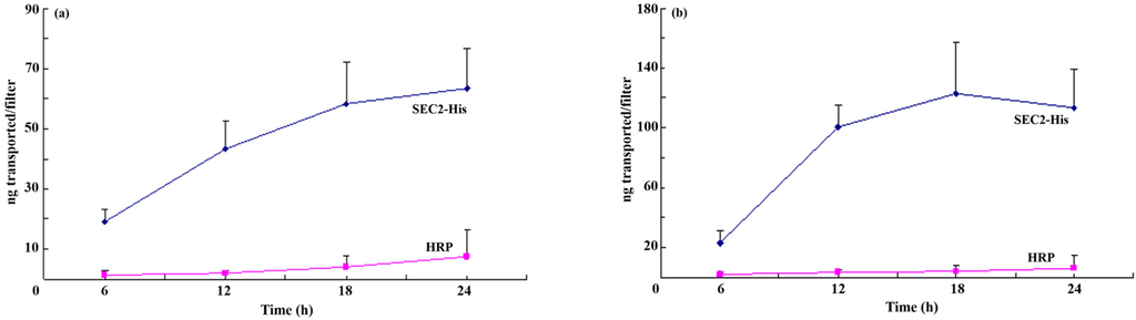 Caco-2 cells, in logarithmic growth phase, were suspended in cell culture medium at 1 × 105 cells/mL. Cell suspensions were added to the 12-well Transwell™ plates (Corning, Corning City, NY, USA). Medium was replaced every other day until confluent monolayers with tight junctions developed as assessed by transepithelial electrical resistance of monolayers that was measured with a Millicell-ERS voltohmmeter (Millipore Corp., Billerica, MA, USA). Only monolayers with transepithelial electrical resistance of ≥900 Ω/cm2 after correction for intrinsic value of empty filter were used to test the ability of Caco-2 cells to transcytose SEC2-His as follows: HRP (40 kDa) was added as an internal control for nonspecific transcytosis because its molecular weight is close to SEC2-His. Medium was removed and the selected filters were washed twice using HBSS (supplementary material). After washing, fresh HBSS containing SEC2-His (7.5 μg/mL) or HRP (10 μg/mL) were added to either the apical (500 μL) or basolateral (1.5 mL) chamber followed by incubation in a horizontal shaker (30 rpm) at 37 °C for 6, 12, 18 or 24 h. After incubation, apical or basolateral medium was collected depending on whether SEC2-His or HRP were added to the basolateral or apical medium. The concentrations of SEC2-His or HRP in collected samples were determined by sandwich ELISA using rabbit anti-SEC2 polyclonal antibody or colorimetric method (Supplementary Material). The integrity of SEC2-His was assayed by western blotting (Supplementary Material).
