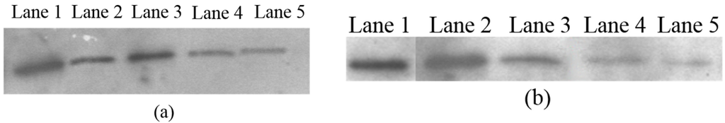 Western-Blotting analysis of transcytosis SEC2-His. (a) Transcytosis of SEC2-His by Caco-2 cells from apical to basolateral surfaces. Lane 1: standard SEC2-His; lane 2: 24-h sample; lane 3: 18-h sample; lane 4: 12-h sample; lane 5: 6-h sample; (b) Transcytosis of SEC2-His by Caco-2 cells from basolateral to apical surfaces. Lane 1: standard SEC2-His; lane 2: 24-h sample; lane 3: 18-h sample; lane 4: 12-h sample; lane 5: 6-h sample.