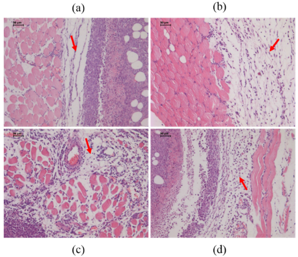 H & E staining of tumor tissues. The areas indicated by red arrows represent the enrichment of immune cells in: (a) the saline group; (b) the SEC2-His (6.4 mg/kg) group; (c) the SEC2-His (16 mg/kg) group; (d) the SEC2-His (32 mg/kg) group. In the saline group, few immune cells were detected near the tumor tissue, while more immune cells were enriched near tumor tissues of treatment groups and cell numbers increased in a dose-dependent manner. Magnification of tumor tissues was 100×.
