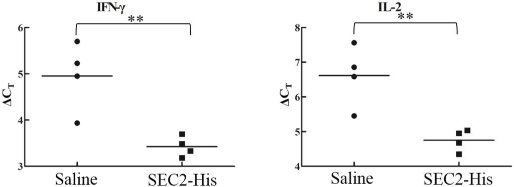 Eight ICR mice were randomly divided into two groups and given by gavage SEC2-His (32 mg/kg) or saline separately. After 24 h we extracted spleen total mRNA to detect the levels of IL-2, IL-4, TNF-α and IFN-γ by Real-time PCR. The results showed Ct (target gene) values in all treatment groups were more than Ct (β-actin), which means that the expression level of β-actin is higher than all target genes. As ΔCt = Ct (target gene) − Ct (β-actin), the larger the ΔCt value was, the lower the relative expression of target genes. As Figure 5 shows, the ΔCt values of all the target genes from the SEC2-His group are smaller than the saline group. So we could make a conclusion that compared with the saline group, the mRNA expression levels of these four cytokines were significantly up-regulated after oral SEC2-His administration in mice. In addition, the average ΔCt (AΔCt) of different target genes were marked in Figure 5 (as shown by the “—”) and the fold changes of mRNA expression levels of IL-2, IL-4, TNF-α and IFN-γ due to treatment with SEC2-His were 3.634, 3.069, 2.480, and 2.886 respectively.