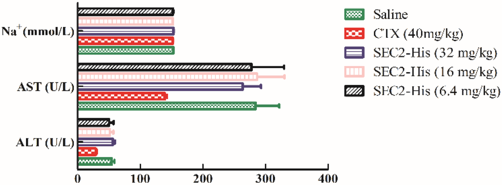We weighed all groups of mice and observed the defecation pattern. The results showed the weight of all groups increased continually, of which the growth rate of treatment groups and the saline group were approximately the same, but the CTX group’s growth rate was distinctly lower than others (Figure 6, Table 2). Meanwhile we did not observe abnormal defecation pattern in any of the groups. Liver and intestinal tissues were stained by H & E to further assay the toxicity of oral SEC2-His. The treatment and saline groups did not show toxicity of liver and intestinal tissues through morphological examination, however, the positive group showed significant liver toxicity (Figure 7). In the meantime, we tested the levels of aspartate transaminase (AST), alanine transaminase (ALT) and Na+ in mice sera. The level of AST, ALT and Na+ in all groups was in the normal range except that the positive group’s AST and ALT were lower than normal values (Figure 8). Therefore, we proved that oral SEC2-His had no obvious toxicity in mice.