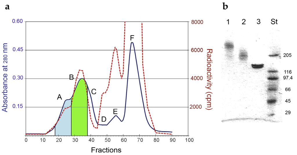 (a) Elution profile of gel-filtration chromatography on a Sephacryl S-200 HR column of Rituximab/saporin-S6 conjugate. The blue line represents the A280, and the red dashed line represents the radioactivity of the eluted fractions. The fractions corresponding to the peaks were pooled and indicated with capital letters: (A) high-molecular-weight immunotoxin (HMW-IT) (blue area); (B) low-molecular-weight immunotoxin (LMW-IT) (green area); (C) free Rituximab; (D) trimmers; (E) dimers and (F) monomers of saporin-S6. (b) Analysis of fractions corresponding to HMW-IT (1), LMW-IT (2), and unconjugated Rituximab (3) by SDS–PAGE under non-reducing conditions on a 4%–15% PhastGel. Standard molecular weights (St) are expressed in kDa.