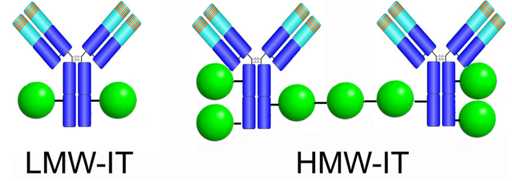 Possible structure of the most represented molecular species of LMW-IT and HMW-IT, generated from Rituximab chemical conjugation to saporin-S6.