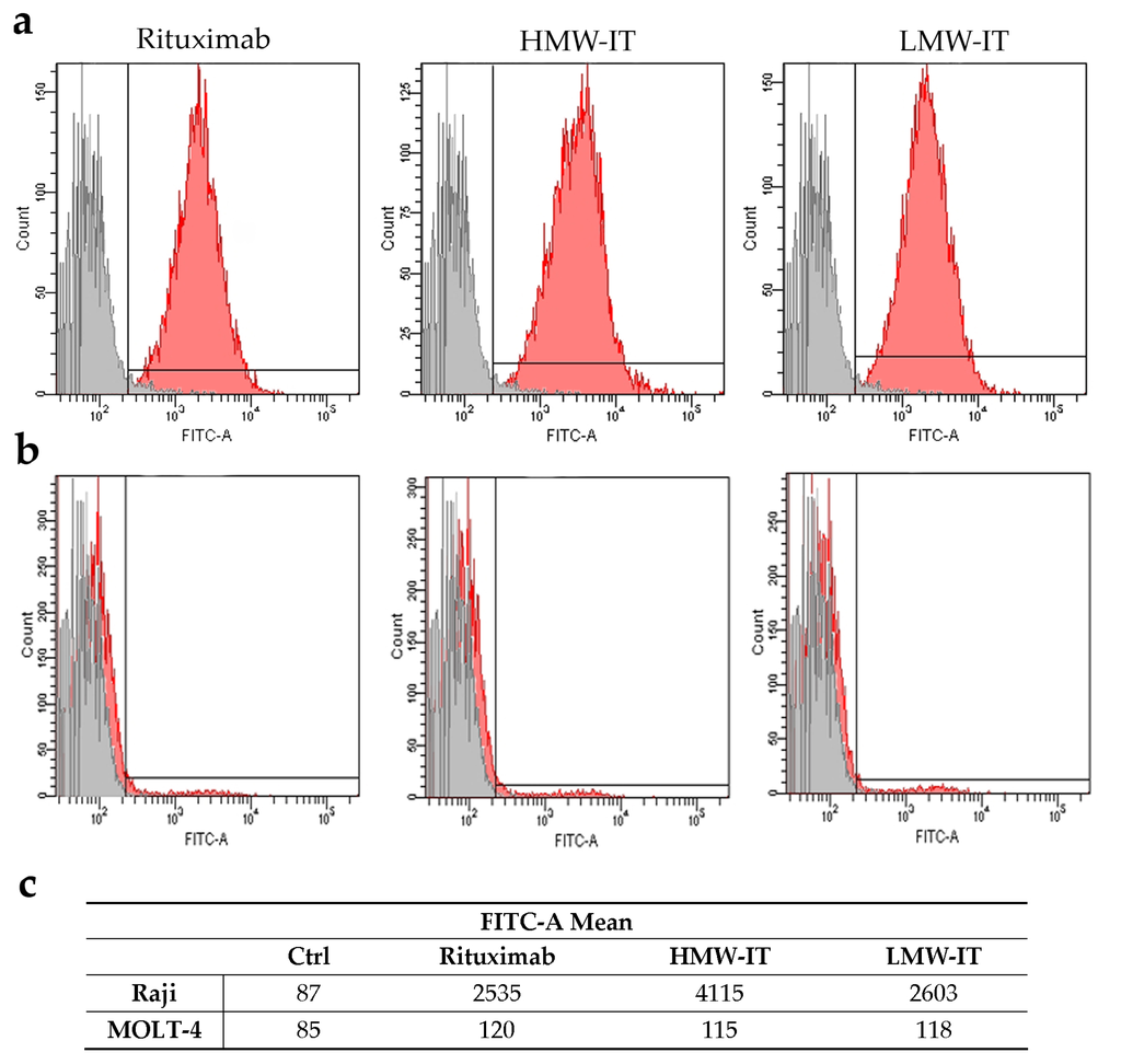 Cytofluorimetric analysis of Rituximab, HMW-IT, and LMW-IT binding on Raji (CD20+) (a) and MOLT-4 (CD20−) (b) cells. Grey histograms indicate the cells incubated without the mAb or immunotoxins. The fluorescence intensity, evaluated as FITC-A mean value, is also reported in the table (c).