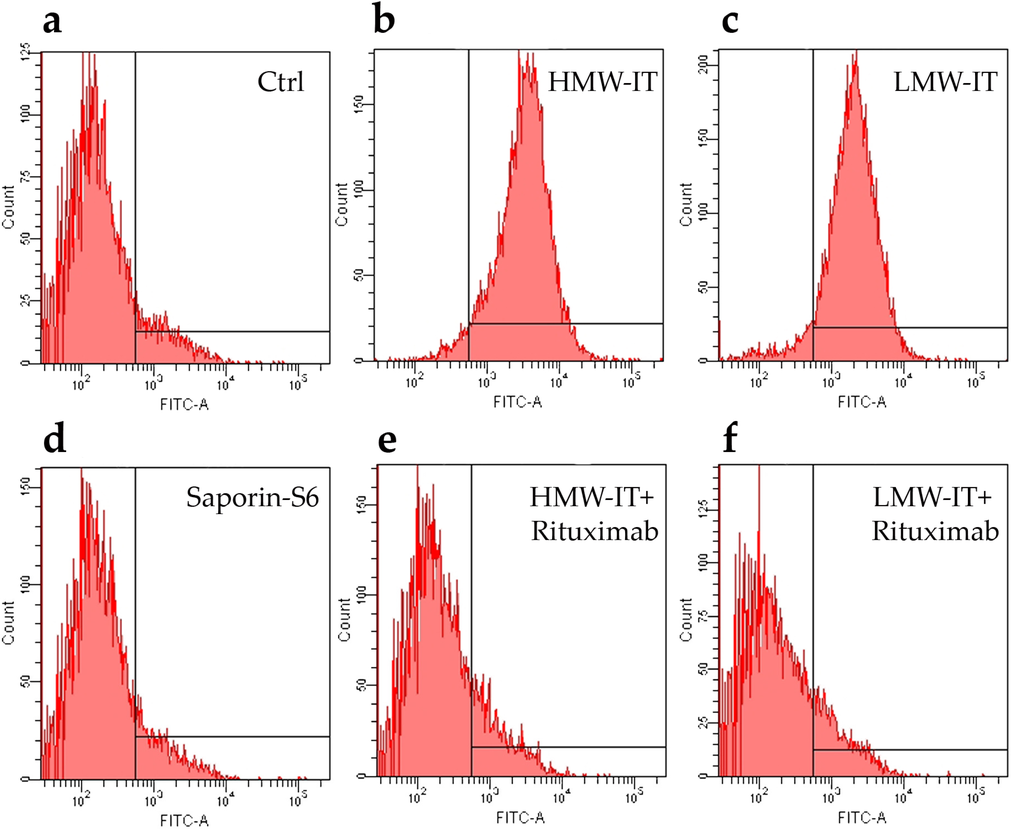 In the Rituximab competition experiments, cells (5 × 105 in complete medium) were collected into round-bottom tubes at 4 °C and incubated with 50 μL of Rituximab at 10−6 M concentration or with 50 μL of PBS, 1% FCS. After 30 min, cells were centrifuged at 500× g for 5 min at 4 °C and treated for 30 min at 4 °C with free saporin-S6, HMW-IT or LMW-IT, at a final concentration of 10−8 M. Control samples were run with complete medium alone. After a wash in PBS containing 1% FCS, cells were incubated for 30 min at 4 °C with 50 μL of rabbit antisera against saporin-S6 (1:100). After a further wash, 50 μL of anti-rabbit FITC antibody were added for 30 min at 4 °C. After three washes in cold PBS, 1% FCS, the samples were fixed with 70% cold ethanol. The fluorescence intensity was assessed as above described.