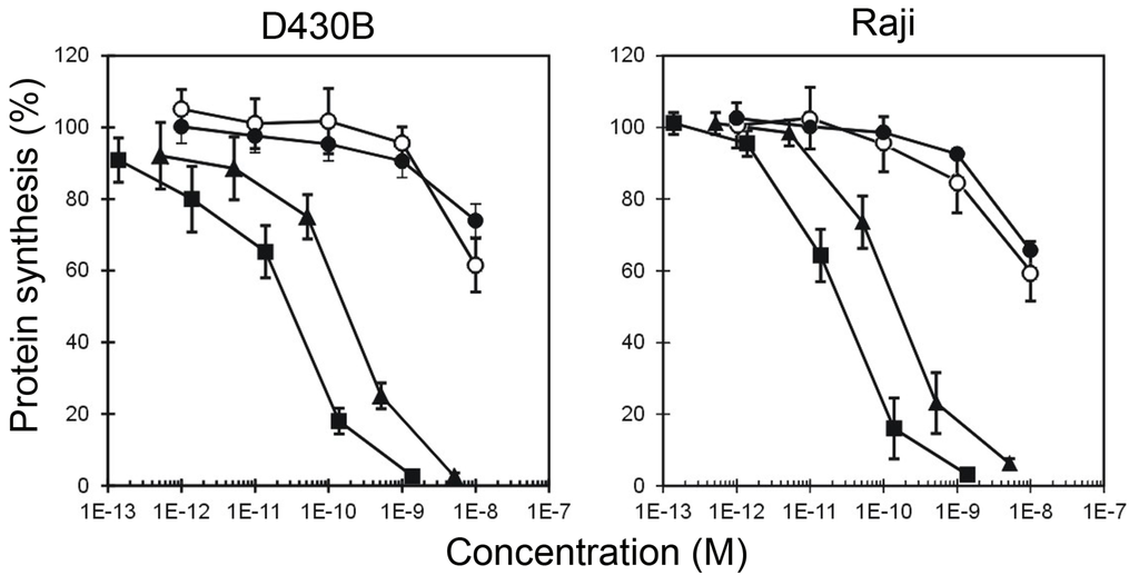 The cytotoxicity of the immunotoxin was evaluated from the inhibition of cellular 3H-leucine incorporation. Cells (5 × 103/well) were seeded in 96-well microtiter plates (Falcon, Becton Dickinson, Franklin Lakes, NJ, USA) in 100 μL of complete medium, and 100 μL of Rituximab-containing immunotoxin was added to final concentrations ranging from 10−13 to 10−8 M. Concentrations are expressed as immunotoxin content. Control samples were run with RIP alone. After 96 h, cells were washed, 5 kBq of l-[4,5-3H]leucine (Amersham) was added, and after a further 6 h, cells were harvested with an automatic cell harvester (Skatron Instruments, Lier, Norway) onto glass-fiber diskettes. The radioactivity incorporated was determined as previously described [44,45].