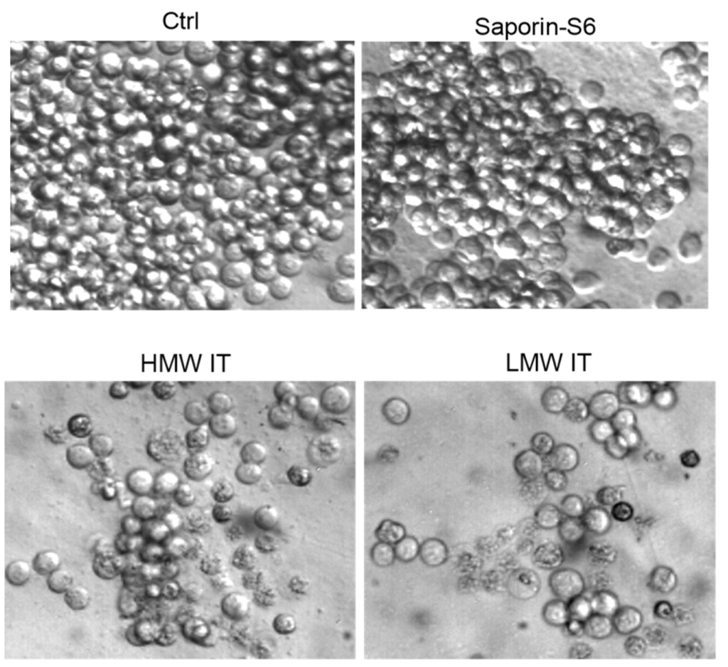 Morphology of Raji cells assessed by phase contrast microscopy. Cells were treated for 96 h with 10−9 M HMW-IT or LMW-IT or saporin-S6. Control cultures (Ctrl) were grown in the absence of immunotoxin or saporin-S6. Magnification: 400×.