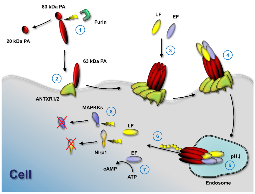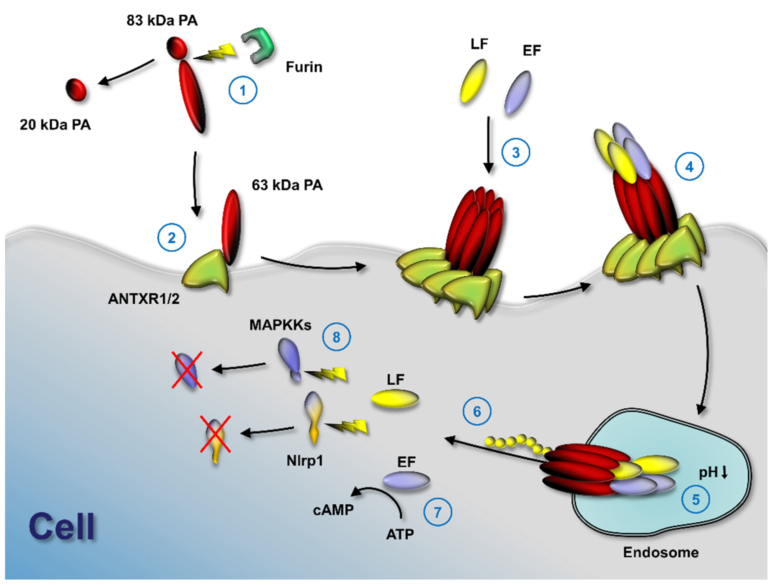 Anthrax toxin activation mechanism. Anthrax toxin protective antigen (PA) is cleaved by furin (1) to enable binding to either of its two known cell surface receptors (2), tumor endothelial marker 8 (TEM8 or ANTXR1) or capillary morphogenesis gene 2 (CMG2 or ANTXR2). PA oligomerizes (3) and the two effector molecules of anthrax toxin, lethal factor (LF) and edema factor (EF), bind to the PA oligomer. If PA forms an octamer, up to four effector molecules can bind at the intersection of PA molecules and internalize by receptor-mediated endocytosis (4); acidification in endosomes results in pore formation by PA (5); LF and EF partly unfold and the unfolded N-terminus is pulled through the pore by a ratchet mechanism. Unfolded LF and EF refold in the cytosol (6) and exhibit their enzymatic functions. EF catalyzes the formation of cytosolic cAMP (7) and LF cleaves several mitogen-activated protein kinase kinases, as well as Nlrp1 (8).