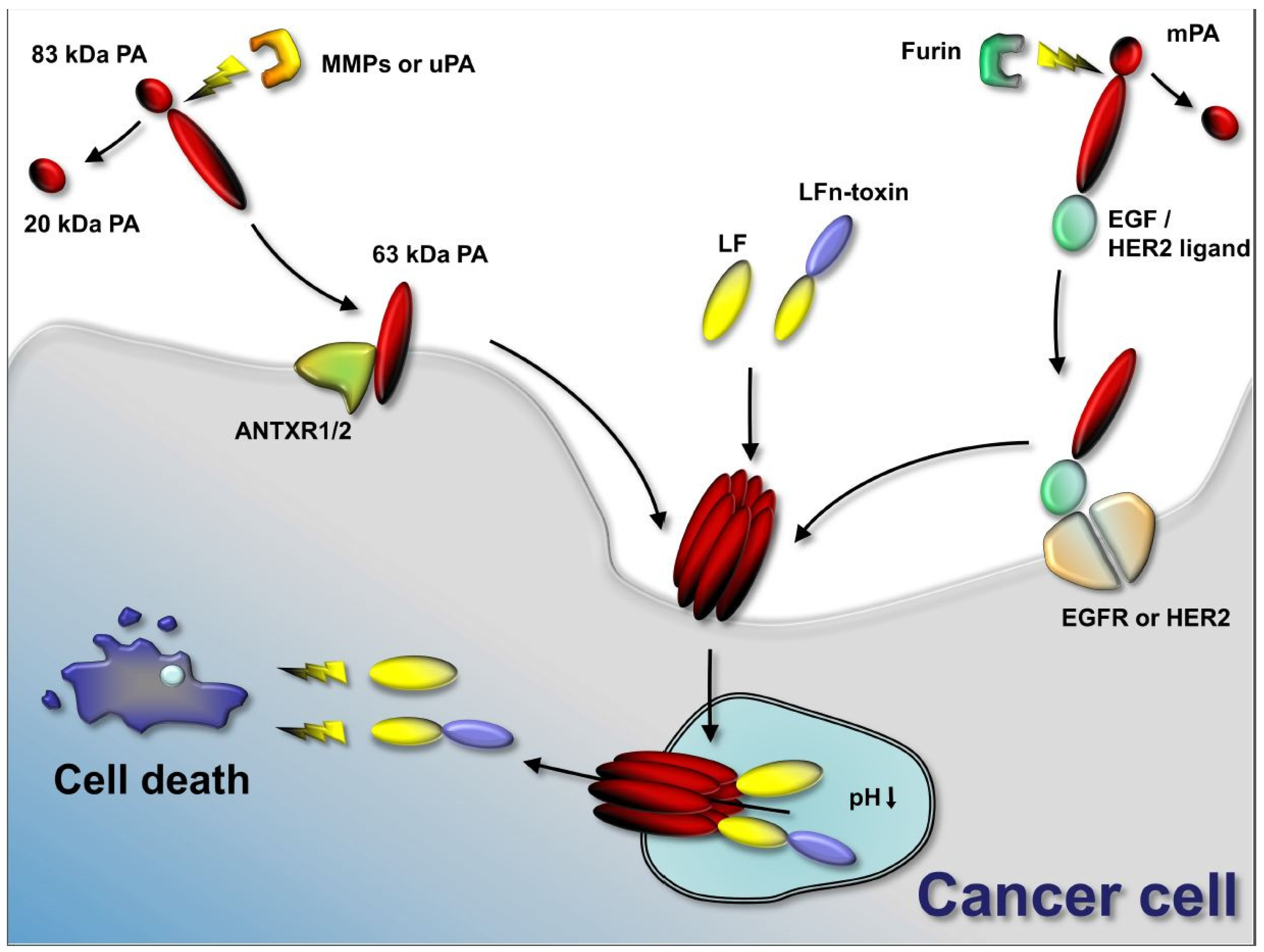 Anthrax toxin use in cancer therapies. Anthrax toxin component protective antigen (PA) can be mutated to contain restriction sites for tumor-selective proteases (such as matrix-metalloproteinases (MMPs) and urokinase plasminogen-activator (uPA)). In the tumor environment, MMPs or uPA cleave the mutated PA and the activated 63-kDa PA fragment binds its target receptors (ANTXR1 or ANTXR2) and assembles to oligomers. Anthrax toxin lethal factor (LF) or fusion proteins containing the N-terminus of LF and other protein toxins or enzymes bind to the PA oligomer. The complex is endocytosed and the low pH in the endosome results in pore formation by the PA oligomer. LF or LFn-toxin fusions unfold and translocate to the cytosol of the cancer cell. LF cleaves mitogen-activated protein kinase kinases and interferes with cellular signaling. Protein toxins delivered to the cancer cell interfere with protein synthesis, induce DNA damage and induce apoptosis. Alternatively to using mutated PA, PA can be retargeted to tumor-selective receptors, such as epidermal growth factor receptor (EGFR) or human epidermal growth factor receptor 2 (HER2) by genetic fusion of PA to EGF or HER2 ligands. Activation occurs in that case by furin and does not require specific tumor-selective proteases. Delivery of LF or LFn-toxin fusion occurs similarly.