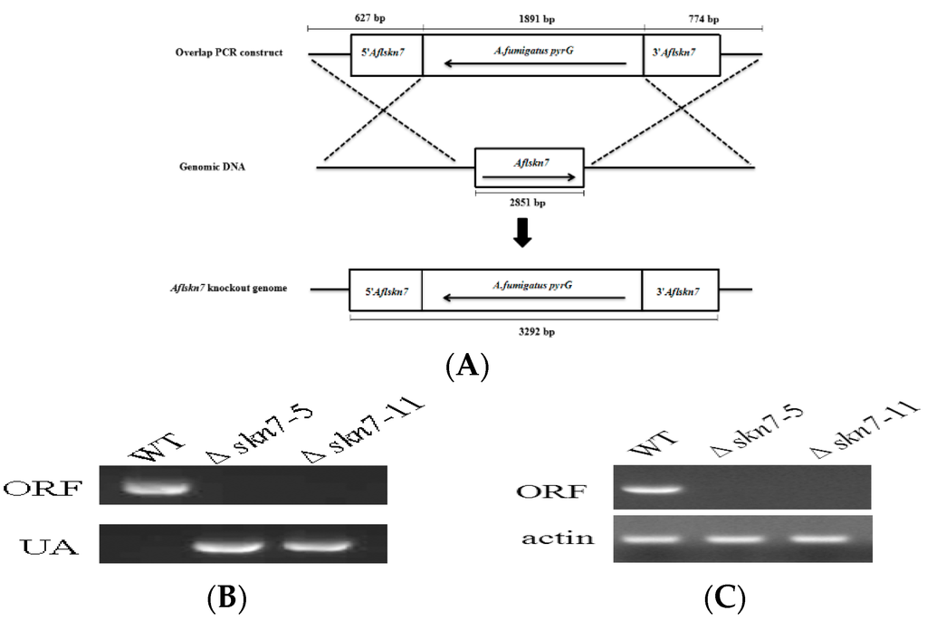Gene deletion method and confirmation. (A) Schematic illustration of the gene deletion method. The numbers indicate the length of the corresponding gene. (B) Polymerase chain reaction (PCR) confirmation of ΔAflSkn7 gene deletion. ORF, AflSkn7 coding region amplified by PCR; UA, 5′ region of AflSkn7 amplified by PCR. (C) Reverse transcription-PCR confirmation of ΔAflSkn7 gene deletion.