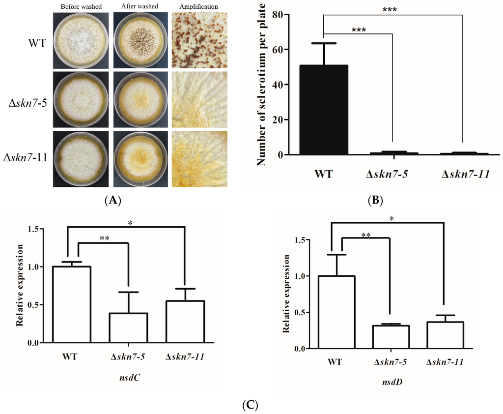 Considering it affects asexual development, the potential roles of AflSkn7 during sexual development were investigated. After culturing fungal strains on yeast extract-sucrose (YES) medium at 37 °C for seven days, all strains were washed with 75% ethanol. There were almost no morphological differences between the wild-type and mutant strains prior to the ethanol wash (Figure 4A, left). After the wash, the wild-type fungus was able to produce sclerotia on YES medium (Figure 4A, top), while both ΔAflSkn7 mutants exhibited severely limited sclerotial production (Figure 4A, middle and bottom). A quantitative analysis revealed that the ΔAflSkn7 mutants produced far fewer than the wild-type strain (Figure 4B). A quantitative RT-PCR (qRT-PCR) method was used to analyze the expression of nsdC and nsdD, which influence sclerotial development. The nsdC expression level in the wild-type fungus was at least two-fold higher than that of the ΔAflSkn7-5 mutant (Figure 4C, left). Additionally, the nsdD expression level was at least four-fold higher in the wild-type strain than in the ΔAflSkn7-5 mutant (Figure 4C, right). These data indicated that AflSkn7 had a considerable effect on A. flavus sexual development.