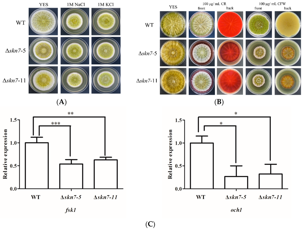 Effects of osmotic and cell wall stresses on wild-type (WT) fungus and two mutants (ΔSkn7-5 and ΔSkn7-11): (A) colony morphology of strains under different salt stress conditions; (B) colony morphology of strains treated with different cell wall damaging agents; and (C) expression analysis of two genes related to cell wall synthesis in WT and mutant fungi. The 2−ΔΔCt method was used to evaluate target gene expression levels, which were relative to the expression level of the β-actin reference gene. Asterisks indicate significant differences from the results of the wild-type fungus (* p ≤ 0.05; ** p ≤ 0.01; *** p ≤ 0.001).