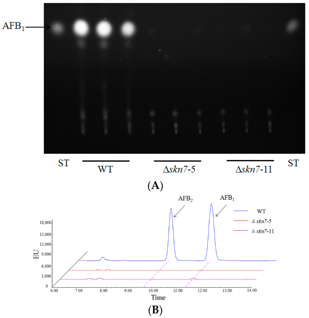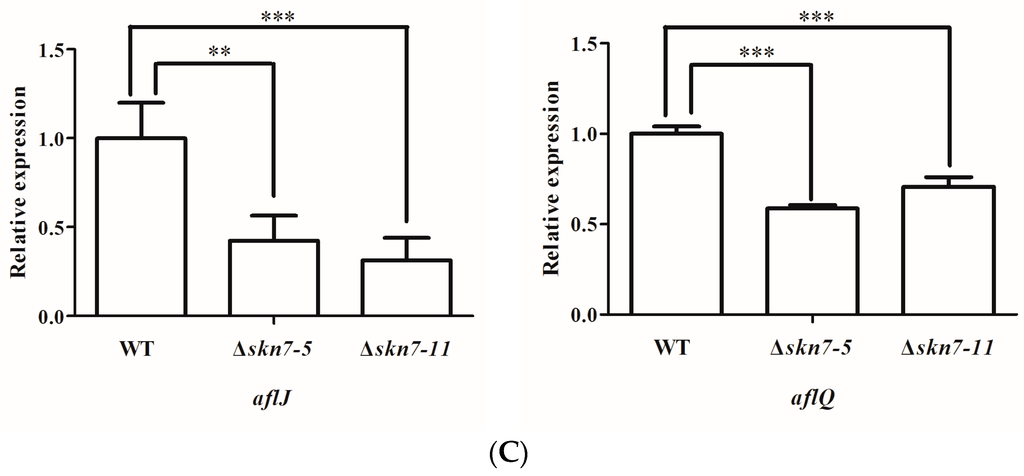 2.7. Role of AflSkn7 for Aflatoxin Biosynthesis