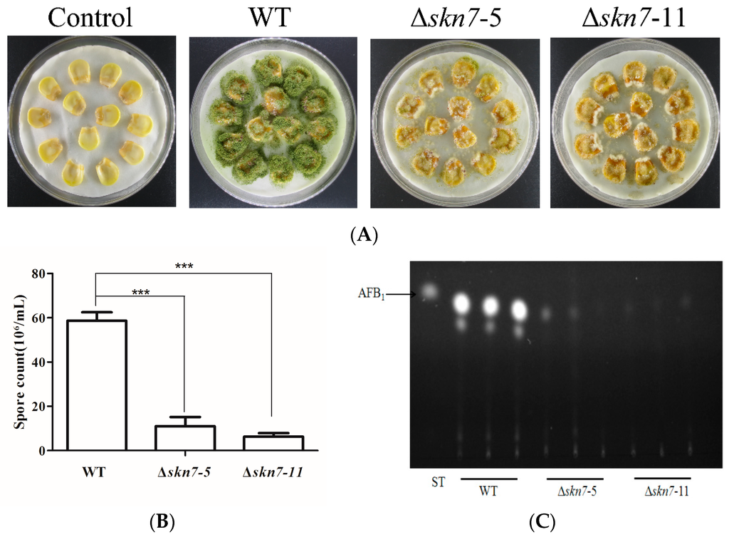 Effects of deletion of AflSkn7 on fungal pathogenicity on maize: (A) maize kernels were treated with water (control), wild-type fungus (WT), or two AflSkn7 deletion mutants (ΔSkn7-5 and ΔSkn7-11) and cultured at 28 °C for seven days; (B) quantitative analysis of conidia collected from infected maize kernels; and (C) thin-layer chromatography analysis of aflatoxin production in infected maize kernels. Asterisks indicate significant differences from the results of the wild-type fungus (*** p ≤ 0.001).