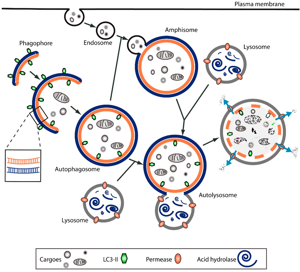 Autophagy can be envisaged as a multi-step process (Figure 1). It is initiated by the formation of an isolation membrane, also known as a phagophore; a double-layered, crescent-shaped membrane whose exact origin is still debated [17,18,22,23]. However, several lines of evidence suggest that the endoplasmic reticulum may serve as the main source of the autophagosome or as a platform for autophagosome formation [22,24]. The phagophore elongates and expands to engulf, selectively or not, intracellular cargoes, which are finally enclosed in the double-membrane autophagosome. This matures through docking and fusion with an endosome (to form the so-called amphisome) and/or a lysosome (to form the autolysosome), where the autophagosome inner membrane and cargo are degraded through acid hydrolases. The resultant macromolecules are recycled back into the cytosol through permeases. Together, all these steps form the so-called autophagic flux.