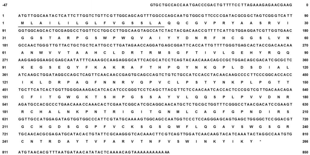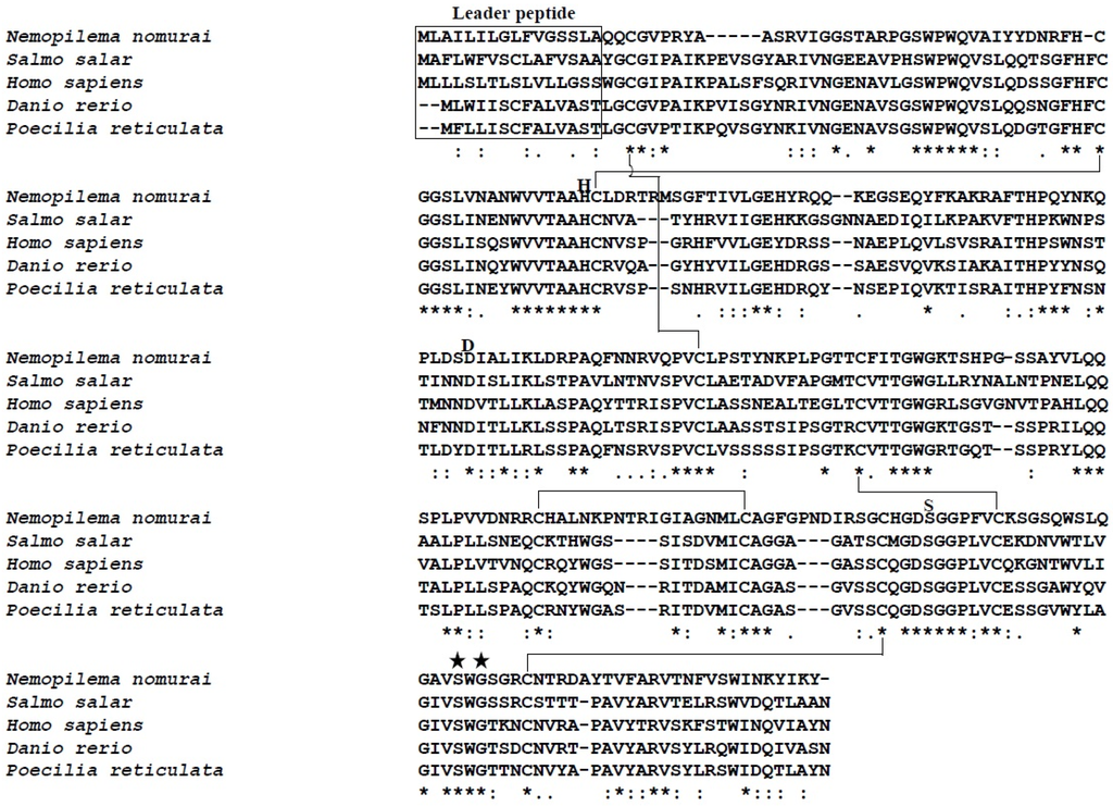The cDNA library of the N. nomurai CTRL-1 gene was constructed to identify the full-length cDNA sequence (GenBank accession no. KU668696) using total RNA that was extracted from the tentacle. The PCR product of full-length cDNA (Figure 2, lane 1) was cloned into the pGEM-T Easy vector and the clone was confirmed with EcoRI digestion on 1.2% agarose gel electrophoresis (Figure 2, lane 2). The CTRL-1 cDNA size is 850 bp, including an 801-bp open reading frame (ORF) that encodes 266 amino acids (Figure 3). The deduced amino acid sequence has a putative signal peptide between residues 17 and 18 and the mature polypeptide has 249 residues. The cDNA sequence of CTRL-1 contains an in-frame stop codon (TAG) and predicted polyadenylation signal (TTTAAT) (Figure 3). A blast analysis of the sequenced CTRL-1 cDNA showed a high degree of identity with those Scyphozoa and Hydrozoa and Actinopterygii. (Table 1). An alignment of the deduced amino acid sequences of N. nomurai CTRL-1 and CTRL-1 of another four species (Salmo salar, Danio rerio, Poecilia reticulata, and Homo sapiens) showed that the 10 cysteine residues involved in disulfide bonds in chymotrypsin, and the catalytic triad residues (His69, Asp117, and Ser216) are highly conserved. The substrate-binding sites are also highly conserved (Figure 4).