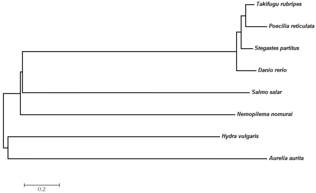 To determine the evolutionary relationships of the N. nomurai CTRL-1 protein with those of other groups, a phylogenetic tree was constructed using the neighbor-joining method. N. nomurai CTRL-1 was more closely related to the Actinopterygian protein than to the Scyphozoan and Hydrozoa proteins. Within the Cnidarian, the N. nomurai CTRL-1 gene was evolutionarily more closely related to the H. vulgaris gene than to the A. aurita gene (Figure 5).