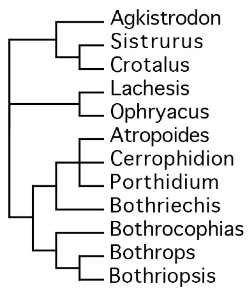 - Parkinson, C.L.; Campbell, J.A.; Chippindale, P.T.; Schuett, G. Multigene phylogenetic analysis of pitvipers, with comments on their biogeography. In Biology of the Vipers; Schuett, G.W., Höggren, M., Eds.; Eagle Mountain Publishing: Eagle Mountain, UT, USA, 2002; pp. 93–110. [Google Scholar]