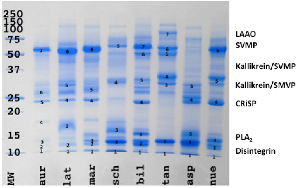 1D SDS page. MW = molecular weight marker; aur = Bothriechis aurifer; lat = Bothriechis lateralis; mar = Bothriechis marchi; sch = Bothriechis schlegelli; bil = Bothrops bilineata; tan = Bothrops taeniata; asp = Bothrops asper; neu = Bothrops neuwiedi bolivianus. Annotation indicates the dominant type in a region. However, other toxin types may also be present (see Supplementary File 1 for full annotation).