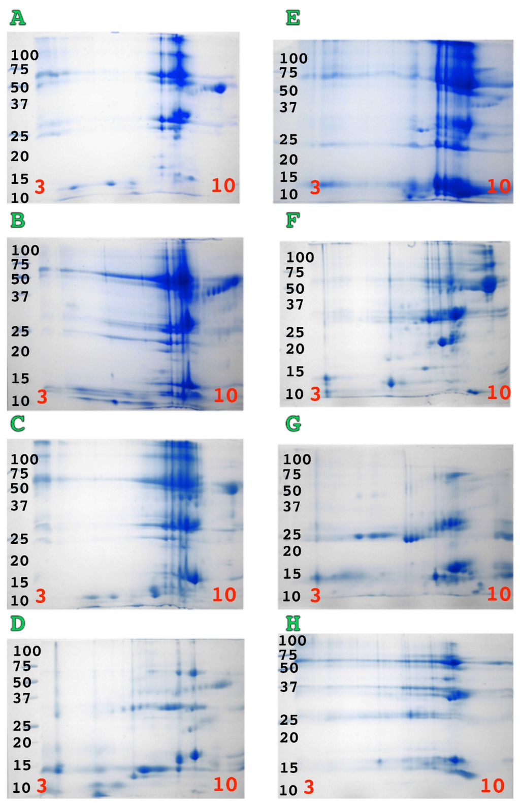 2D SDS page analysis of (A) Bothriechis aurifer; (B) Bothriechis lateralis; (C) Bothriechis marchi; (D) Bothriechis schlegelli; (E) Bothrops bilineata; (F) Bothrops taeniata; (G) Bothrops asper and (H) Bothrops neuwiedi bolivianus. pI range is 3–10 (left to right) and molecular weight markers are as for Figure 2.