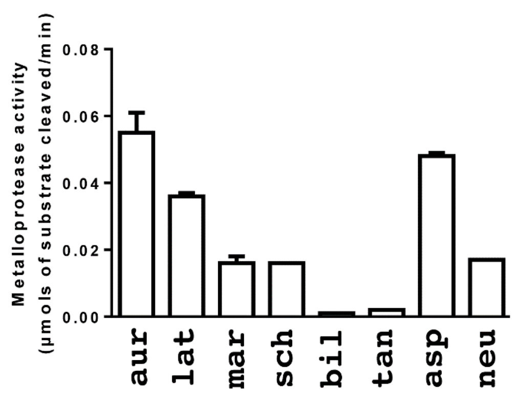 Metalloprotease activity of venom—Metalloprotease activity of venom (10 ng/µL) was measured based on its ability to cleave a fluorogenic peptide substrate (Mca-PLGL-Dpa-AR-NH2, 10 µM final). aur = Bothriechis aurifer; lat = Bothriechis lateralis; mar = Bothriechis marchi; sch = Bothriechis schlegelii; bil = Bothrops bilineata; tan = Bothrops taeniata; asp = Bothrops asper; neu = Bothrops neuwiedi bolivianus.