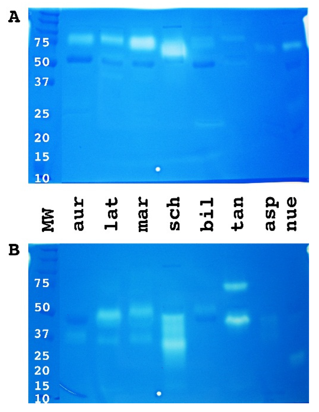 Crude venom zymography gel analysis using casein (A) and gelatin (B) as protein substrates. MW = molecular weight marker; aur = Bothriechis aurifer; lat = Bothriechis lateralis; mar = Bothriechis marchi; sch = Bothriechis schlegelii; bil = Bothrops bilineata; tan = Bothrops taeniata; asp = Bothrops asper; neu = Bothrops neuwiedi bolivianus.
