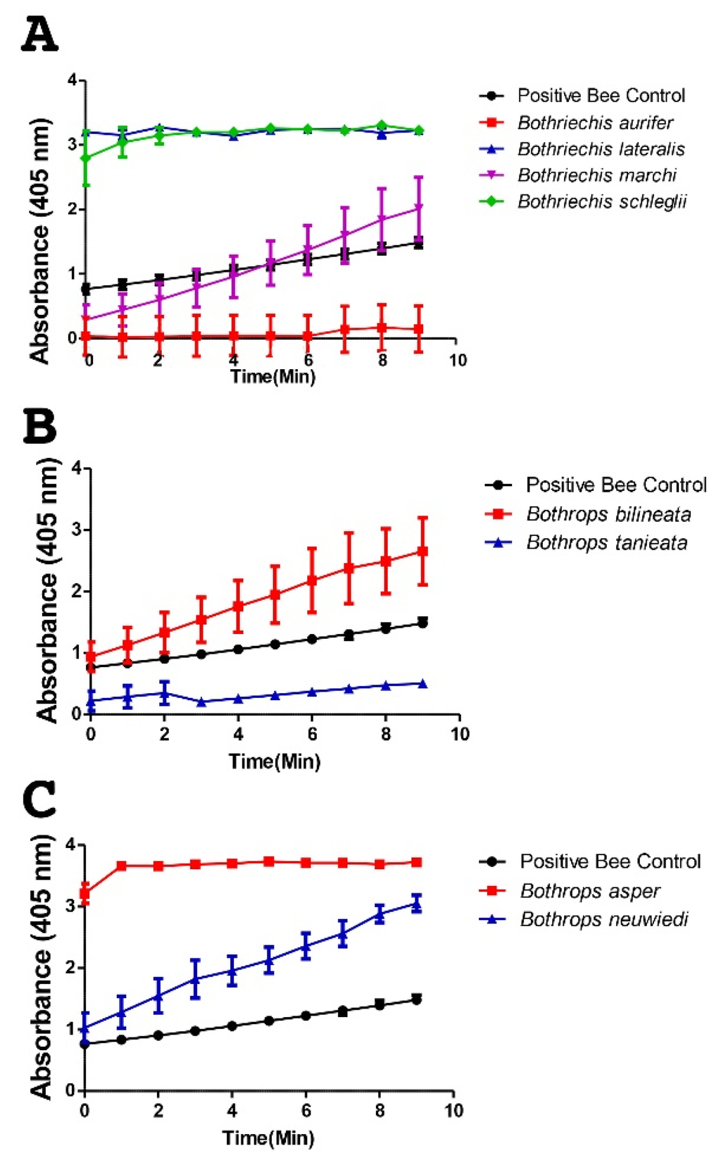 Phospholipase A2 enzymatic activity profiling measured by means of absorbance over time at 1 µg for (A) Bothriechis species; (B) arboreal Bothrops species and (C) terrestrial Bothrops species.