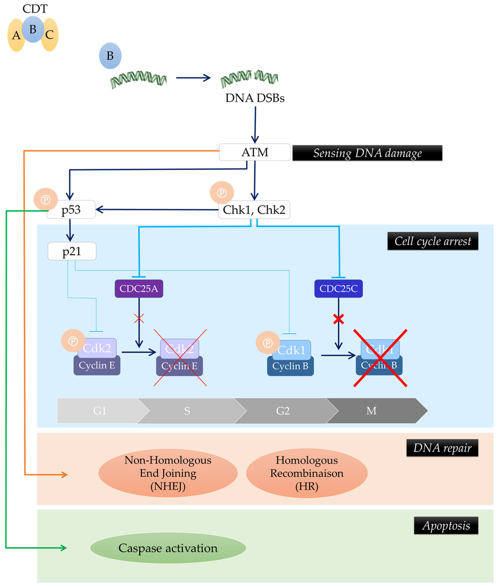 Cytolethal distending toxin (CDT)-producing bacteria induce the DNA Damage Response (DDR). CdtB induces DNA double-strand breaks (DSBs). As a result of DSBs, DNA damage response (DDR) is activated. This response is mediated by ATM (Ataxia telangiectasia mutated), leading to cell cycle arrest and initiation of DNA repair via homologous recombination (HR) and non-homologous end-joining (NHEJ) mechanisms. In some cases, the DDR system fails to properly repair DNA damage, leading to cell death by apoptosis or to long-term cell cycle arrest (known as senescence). A, B and C represent the CDT subunits (Adapted from []).