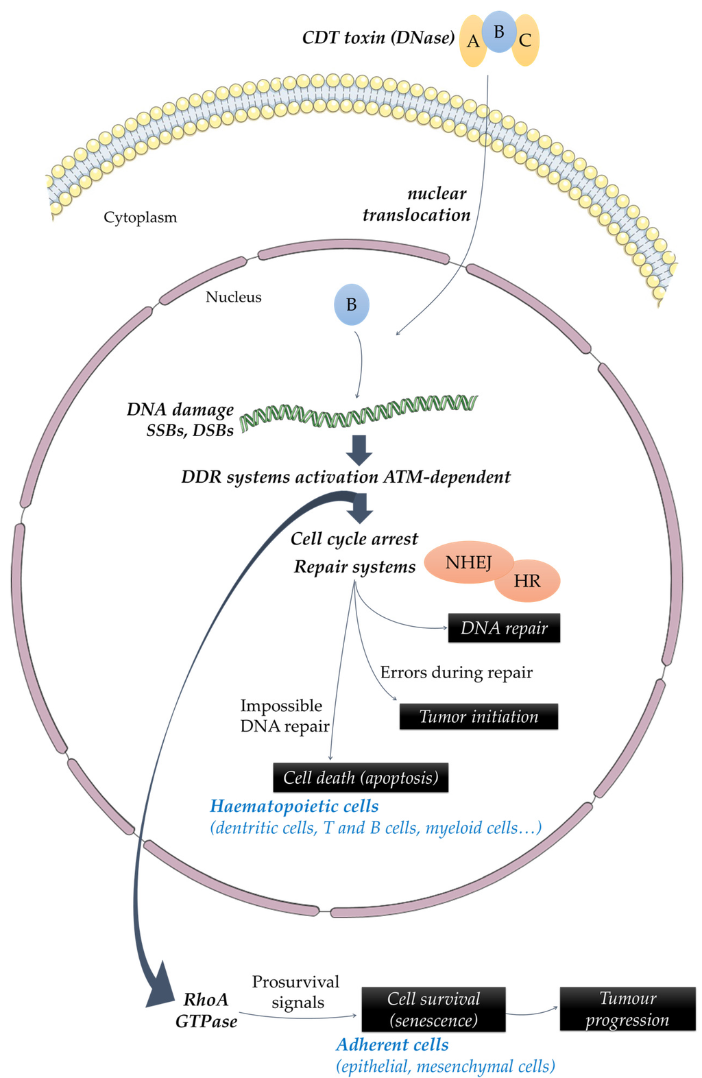 As previously mentioned, CDT toxin presents a DNase activity, leading to DNA damage. DNA damage are lesions associated to cancer and it is tempting to speculate that CDT-induced DNA damage might be involved in cancer promotion/progression. Furthermore, it has been shown in vitro, that chronic intoxication with sublethal doses of CDT does not cause cell death or cell cycle arrest. Instead, it induces limited DNA damage, increases the frequency rate of mutations and consequently, results in chromosomal instability []. This genomic instability leads to activation of DDR systems and pro-survival signals enhancing anchorage-independent growth [], which are traits of malignant transformation. These observations support the notion that CDT might promote tumor initiation and progression.