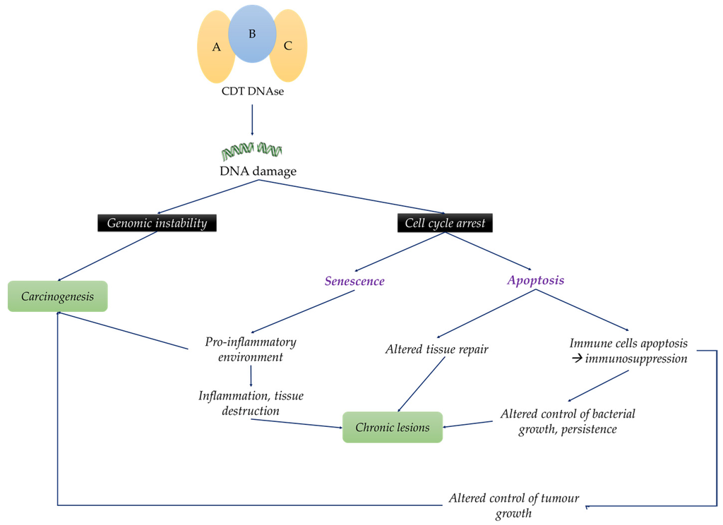 Impact of CDT-producing bacteria on infected host CDT by inducing DNA damage modifies host-physiology leading for example to a relative immunosuppressive environment, a pro-inflammatory environment or an arrest of the cell cycle. The combination of these alterations explains clinical manifestations associated to CDT-infection, mainly chronic lesions and carcinogenesis. A, B and C represent the CDT subunits.