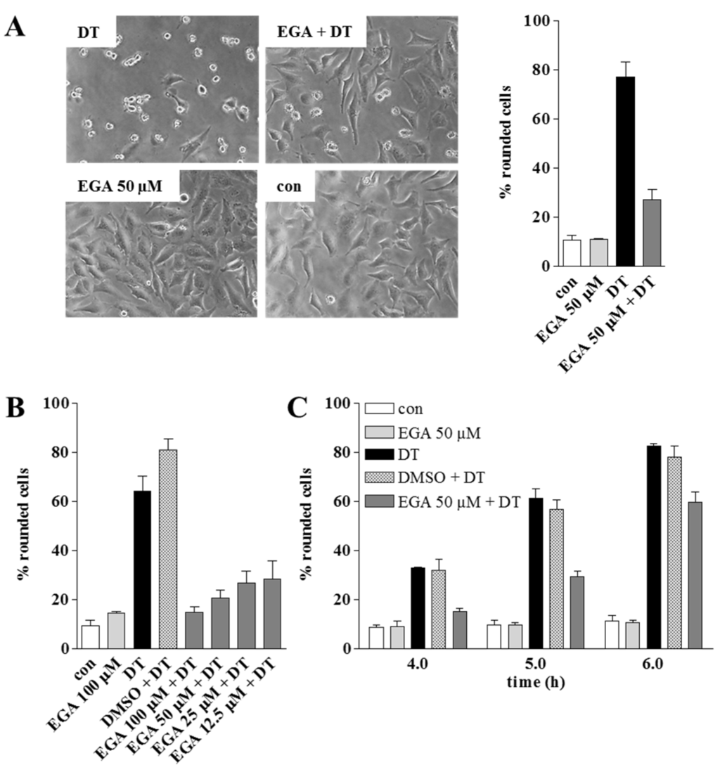 EGA protects HeLa cells from intoxication with DT. Cells were pre-incubated for 1 h at 37 °C with EGA or the solvent DMSO for control. Thereafter, DT (0.86 nM) was added and cells were further incubated at 37 °C. For control, cells were left untreated (con) or incubated with DT in the absence of EGA (DT). At the indicated time points, phase contrast pictures were taken and for quantitative analysis, the percentage of rounded cells was determined. Values are gives as mean ± SD (n = 3). (A) Protective effect of 50 µM EGA on the intoxication of cells with DT. Representative pictures after 4 h are shown; (B) Concentration-dependent inhibition of DT-intoxication after 4 h by EGA, determined in a separate experiment. The maximum dosage of EGA (100 µM) was tested on cells without DT to exclude any morphological alteration of the cells in response to EGA alone. In addition, a DMSO solvent control of the maximum dosage was performed; (C) Time-dependent inhibitory effect mediated by 50 µM EGA, determined in a separate experiment with confluent cells.