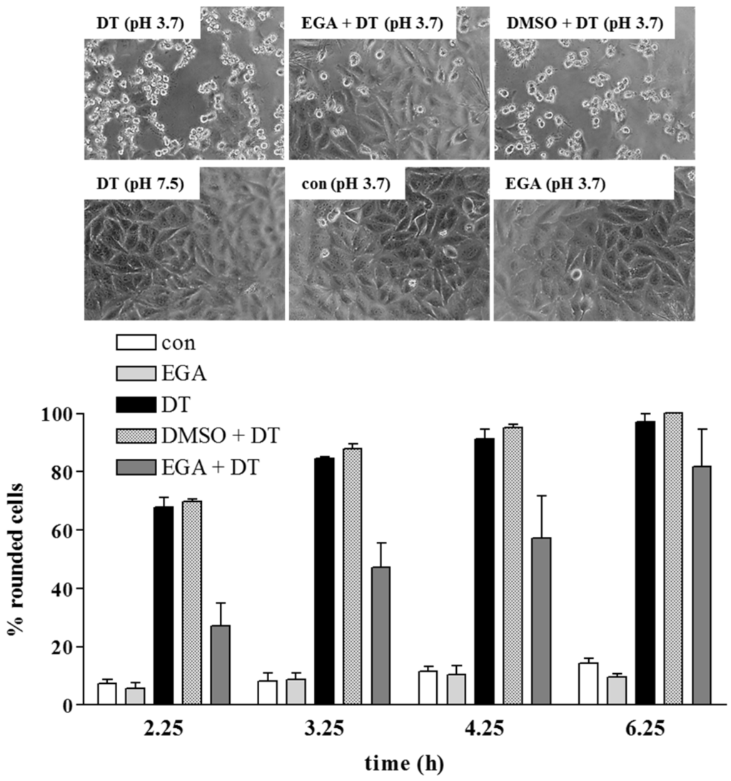 The pH-dependent translocation of DT across endosomal membranes was experimentally mimicked on the cytoplasmic membranes of intact cells and performed as described earlier [5]. In brief, HeLa cells were pre-incubated in serum-free medium with Baf A1 (100 nM) plus EGA (50 µM) or the vehicle DMSO for 1 h at 37 °C. Then, the cells were kept on ice for 10 min followed by an incubation with nicked DT (13 nM) for 40 min at 4 °C to allow binding of the toxin to the cell surface. Thereafter, to trigger pH-driven toxin-translocation across the surface membrane, cells were exposed to an acidic pulse (pH 3.7) for 15 min at 37 °C. Additional wells with toxin-treated cells were treated with neutral medium (pH 7.5) for control. Subsequently, all cells were further incubated at 37 °C in neutral medium containing FCS, Baf A1 (100 nM) ± EGA (50 µM). After the given incubation periods, DT-induced cell-rounding was monitored using photography. From these, the amount of rounded cells was determined in per cent of total cell count per picture.