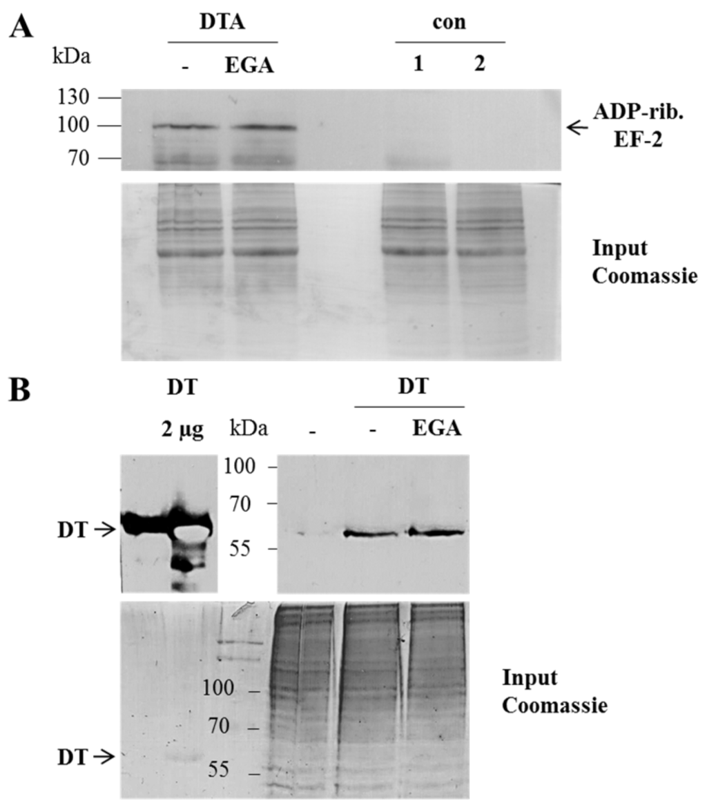 DTA (100 ng) was pre-incubated for 10 min at 37 °C with EGA (50 µM) or left untreated for control followed by the addition of HeLa lysate protein (20 µg) and biotin-labelled NAD+ (10 µM). After further incubation of the samples for 10 min at 37 °C, the proteins were subjected to SDS-PAGE, blotted onto a nitrocellulose membrane. Finally, biotin-labelled (i.e., ADP-ribosylated) EF-2 was detected using Western blotting.