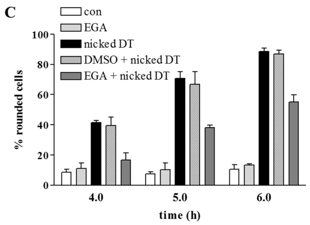EGA inhibits the membrane transport of DTA in cells. The effect of EGA on the membrane transport of DTA was investigated by using a well-established assay where the endosomes acidic environment is mimicked on the surface of cultured HeLa cells. DT was allowed to bind to the receptor at 4 °C where no endocytosis occurs and the normal toxin uptake via acidic endosomes was inhibited by bafilomycin A1 treatment. When such cells are exposed to warm acidic medium, DTB inserts into the plasma membrane and mediates the translocation of DTA into the cytosol where it ADP-ribosylates EF-2 leading to cell-rounding, as shown in Figure 2. No cell-rounding was observed under neutral conditions, by incubation of cells in the acidic medium in the absence of DT, or in the presence of EGA without DT (Figure 2), indicating that cell-rounding is indeed specifically induced by the action of DTA, as described earlier [5,20]. Importantly, the DT-induced cell-rounding was significantly reduced when cells were pre-treated with EGA (Figure 2). Given that this inhibitor did not inhibit the in vitro enzymatic activity of DTA (Figure 3A) nor the binding of DT to HeLa cells (Figure 3B) and it leads to inhibition of intoxication also when applied after receptor-binding of nicked DT (i.e., DT that was proteolytically activated in vitro prior to its application to the cells) (Figure 3C), our results strongly suggest that EGA interferes with the toxin pH-dependent transport. In addition, the results obtained by performing the translocation assay with nicked DT also exclude an effect of EGA on the proteolytic activation of DT during cellular uptake on the cell surface and/or in endosomal vesicles. To demonstrate that the observed inhibitory effect of EGA was mediated by the molecule itself, in each experiment a vehicle control (DMSO) was performed in parallel to EGA treatment. In contrast to EGA, DMSO did not inhibit the intoxication of cells with DT (see Figure 1B,C) or the translocation of cell-bound DT (Figure 2).