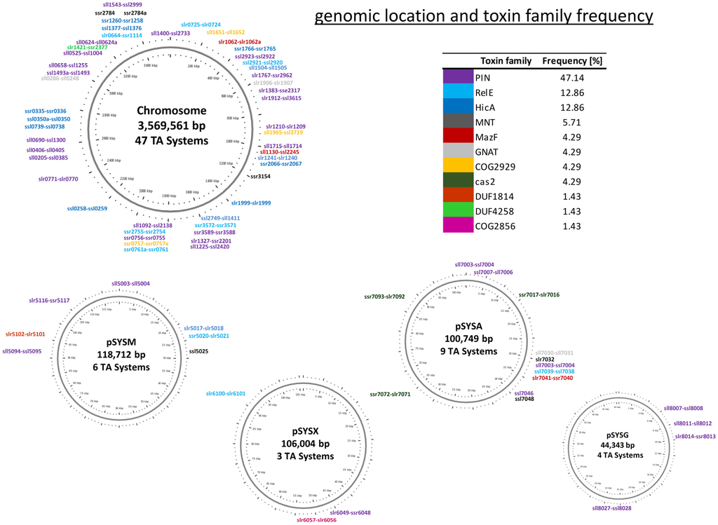 Frequency and distribution of Type II TA families in Synechocystis 6803. The classification of the 69 TA loci is based on the respective toxin component and given in %. The location of these loci over the chromosome and the four large plasmids is shown on the genomic maps. The color code of the TA loci matches the color code in the tabular overview. The length of plasmid pSYSA is according to reference [32]. Here, the three cas1-cas2 gene pairs on plasmid pSYSA were not counted.