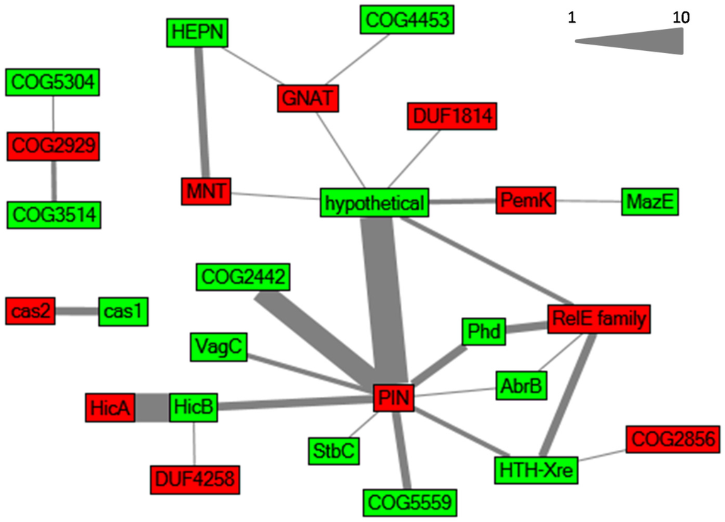 Relationships between different toxin and antitoxin families in Synechocystis 6803, illustrated in a network graph inspired by Makarova et al. [3]. Toxin and antitoxin families are depicted in red and green, respectively. The edges connect toxin and antitoxin families that were identified as cognate toxic and antitoxic components organized in a putative TA operon. The thickness of an edge is proportional to the abundance of the toxin–antitoxin combination. The scale represents the correlation between operon abundance and line thickness.