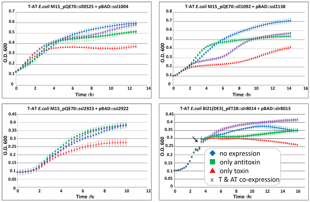 Effect of potential cyanobacterial toxin and antitoxin overexpression on growth of E. coli M15(pREP4) and Bl21(DE3) Rosetta™ harboring the plasmids pQE70::toxin or pET28a(+)::toxin and pBAD::antitoxin. Multiple TA systems were tested: genes sll0525–ssl1004; sll1092–ssl2138; and ssl2923–ssl2922; slr8014–slr8013. Expression of the potential toxins causes growth inhibition in the expression strains (red triangle), which can be prevented by co-expression of the respective antitoxin (purple crossed). Strains without expression are indicated by the blue diamond lines, and lone expression of antitoxin is indicated by the green square lines. The experiments were performed in duplicates or triplicates, and standard deviations are indicated. T-AT, toxin–antitoxin; O. D., optical density; T & AT co-expression, toxin and antitoxin co-expression. For studying slr8014–slr8013, the culture was grown in LB medium to an optical density (O. D.) of ~0.3 and then split (indicated by the black arrow). Subsequently, the effect of lone toxin expression (red triangle), antitoxin expression (green square lines), co-expression (purple crossed) and the untreated control (blue diamond) was measured as described above.
