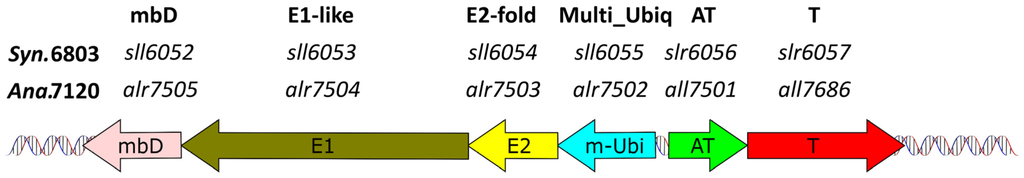 Genetic organization of a likely bacterial multiubiquitin and functionally associated genes in connection to a TA system on plasmid pSYSX of Synechocystis 6803 (Sy.6803), compared to a similar system in Anabaena (Nostoc) sp. PCC 7120 (Ana.7120). mbD, metal binding domain; E1, functionally related to ubiquitin activating enzyme E1; E2, functionally related to ubiquitin transferring enzyme E2; m-Ubi , multiubiquitin; AT, antitoxin; T, toxin.