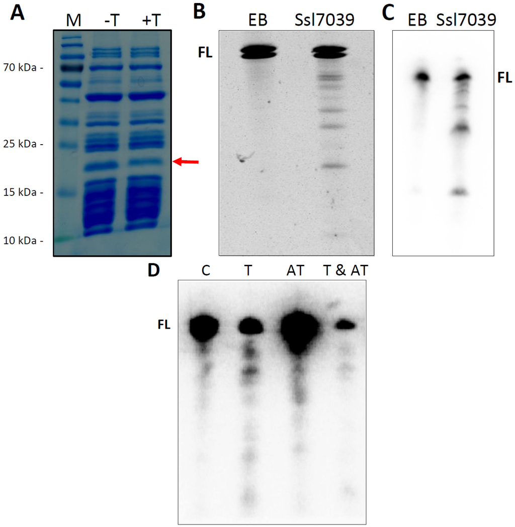 Purified toxin Ssl7039 exhibits ribosome-independent RNase activity. (A) Addition of Ssl7039 to the coupled transcription-translation approach, expressing the DHFR control template, decreases DHFR protein abundance. The DHFR band is labeled by an arrow. The synthesis reaction were separated on 10% SDS–PAA gel electrophoresis and visualized by Coomassie staining. M, marker (PageRuler, Thermo Fisher Scientific); -T, no addition of purified Ssl7039; +T, addition of purified Ssl7039. (B) In vitro synthesized dhfr mRNA was incubated for 30 min with purified toxin Ssl7039, resulting in a clear cleavage pattern. Incubation with elution buffer (EB) served as control. The reaction were separated on 6%–10% 7 M urea polyacrylamide gels (6 mA, 1.5–2.5 h) and visualized by ethidium bromide staining. FL, full length dhfr mRNA (~500 nt). (C) Total RNA from the coupled transcription/translation approach was extracted 2 h after toxin addition, followed by northern analysis targeting the dhfr mRNA. EB, elution buffer control; Ssl7039, addition of purified Ssl7039. (D) Expression of Ssl7039 decreases lpp mRNA stability in vivo. The expression strain E. coli Bl21 (DE3) Rosetta, harboring the plasmid pET28a(+)::ssl7039 and pBAD::ssl7038, was grown in LB medium to an optical density (O. D.) of 0.3–0.4 and then split before addition of the appropriate inducer. Total RNA was extracted 30 min after inductor addition, followed by northern analysis aimed at the lpp mRNA. FL, full length lpp transcript; C, no inducer; T, toxin expression; AT, antitoxin expression; T & AT, both toxin and antitoxin expression.