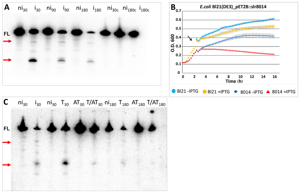 We evaluated the potential RNase activity of the heterologously expressed toxin Slr8014 in vivo. For this aim, we performed northern analysis on lpp mRNA stability after toxin induction in the E. coli Bl21 (DE3) Rosetta pET28a(+)::slr8014 expression strain (Figure 7). Northern analysis showed time dependent lpp mRNA decay, which resulted in a prominent small and a faint large cleavage product compared to the non-induced strain (Figure 7A). Parallel growth inhibition assays showed that, compared to the strain with no expression, lone induction of Slr8014 caused significant growth inhibition (Figure 7B).