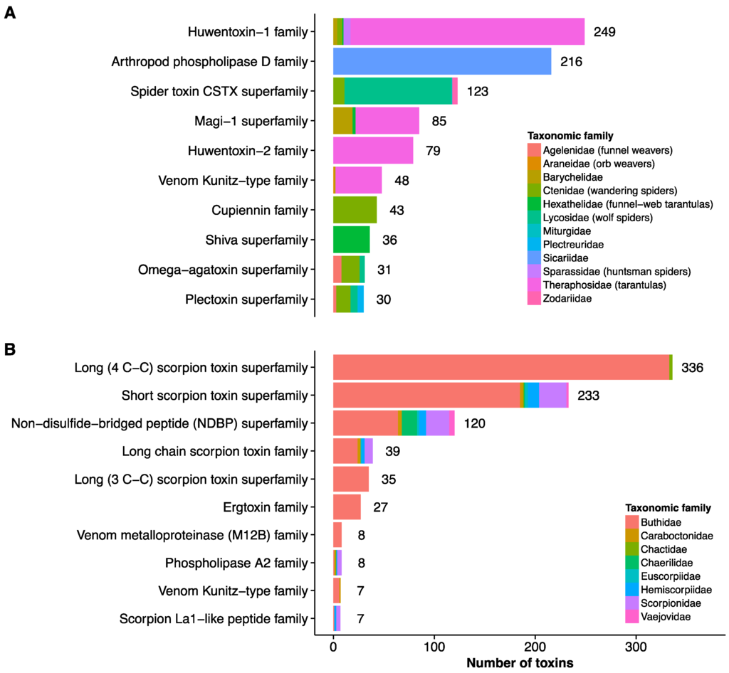 The ten protein families with the highest number of entries among the annotated (A) spider and (B) scorpion toxins in the UniProtKB database [42]. For spiders 543 toxins do not belong to any of the top ten protein families, while this number is 129 for scorpions. The bars are colored according to the taxonomic family affiliation of each toxin entry.