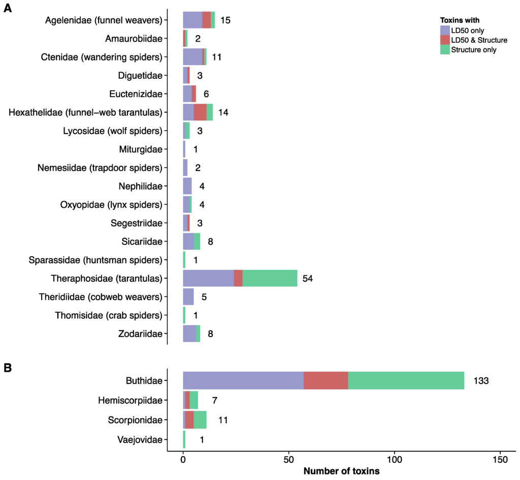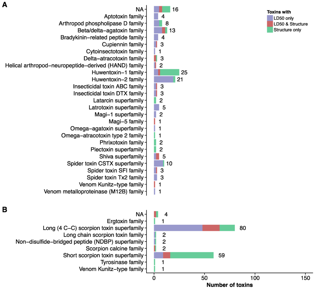 Number of toxins in each taxonomic family for which LD50s and/or three three-dimensional structures have been reported in the UniProtKB database [42]. (A) Spider toxins; (B) Scorpion toxins.