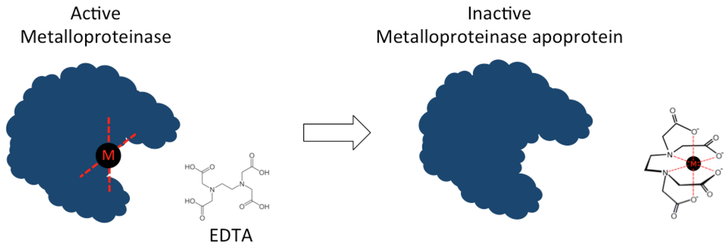 Mechanism of inactivation of metalloproteases. The chelation agent EDTA chelates metal ions and scavenges these from active metalloproteases leaving behind the inactive metalloprotease apoprotein.