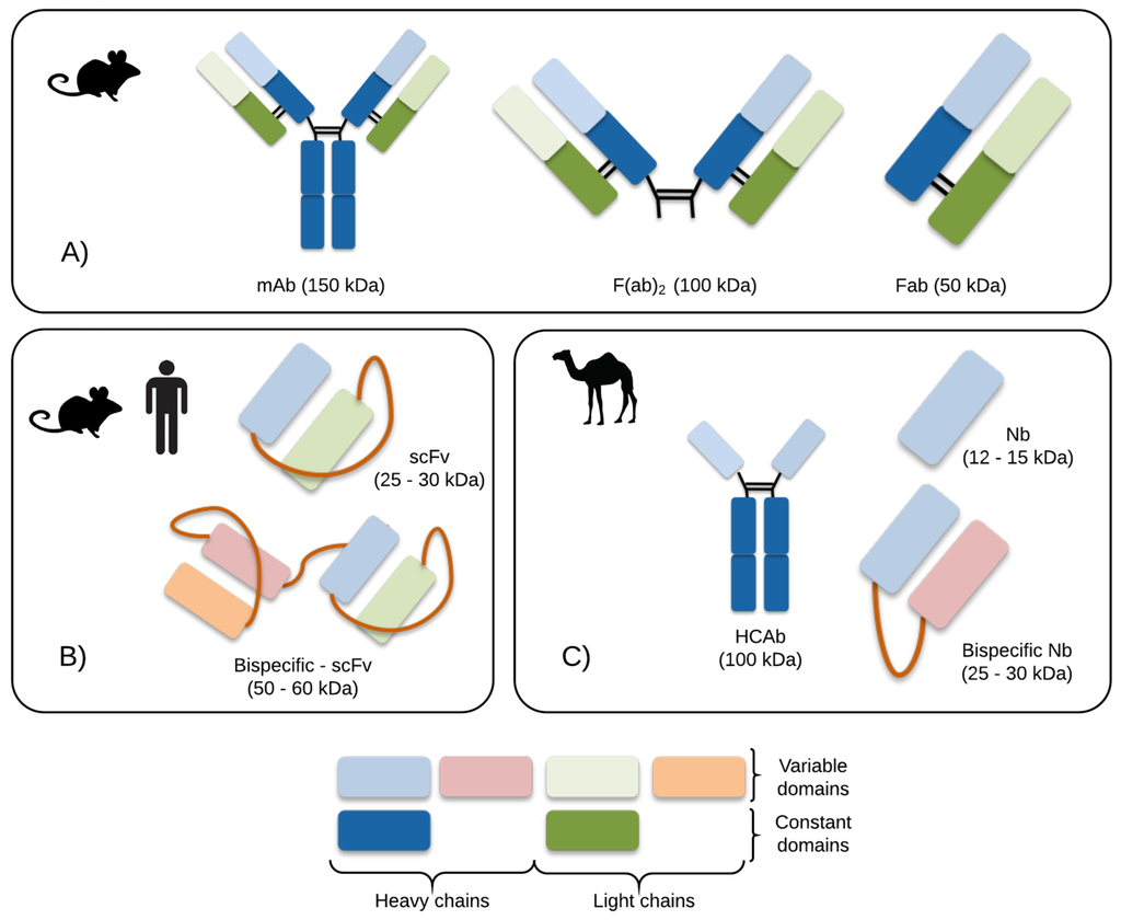 Schematic representation of the antibody formats mentioned in the text. (A) Whole mAb and mAb fragments obtained after enzymatic cleavage, usually derived from hybridoma cell lines; (B) Recombinant antibody molecules of human or murine origin, usually selected from synthetic libraries by phage display selection; (C) Camelid heavy chain antibody (HCAb) and derived formats.