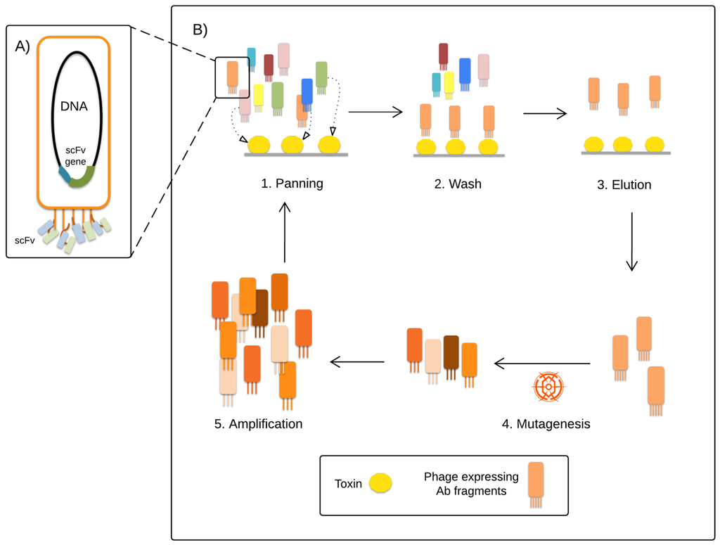 Schematic representation of a directed evolution approach by phage display selection coupled to mutagenesis for discovery of high affinity antibody variants. (A) Representation of a phage particle encoding and displaying scFv molecules on its surface. (B) Phage particles displaying a library of antibody fragments are panned against the target toxin (1). Strongly binding phages remain bound to the target, while non-binding phages are washed away (2). Binding phages are eluted and (3) submitted to mutagenesis, usually by error prone PCR or chain shuffling, with the intention of obtaining phage particles with enhanced affinities towards the target (4). The obtained mutants are amplified in E. coli and submitted to new panning rounds (5). After a few iterative cycles, the most strongly binding phages are eluted, and their DNA is sequenced to reveal which antibody fragments bound most strongly to the target.