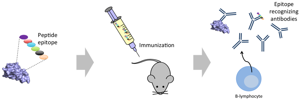 Schematic representation of the use of peptidic epitopes for immunization. A peptide containing the most reactive epitope sequence(s) from selected toxin(s) is constructed and used for immunization of mice. In a successful immunization, the antibodies raised will not only target the peptide, but also the parent toxin(s).