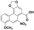 Neutralization studies on venom from the Brazilian yellow scorpion (Tityus serrulatus) with Aristolochic acid demonstrate that this polyphenolic compound has the ability to decrease lethality in mice [132]. Although focus in this study was on hyaluronidase enzymes, direct inhibition of hyaluronidases was not tested. Other studies have shown, however, that Aristolochic acid has an inhibitory effect on phospholipases A2 (PLA2s), which are found in scorpion venoms [120,132]. To date, no inhibition studies with Aristolochic acid on PLA2s from spider venom have been reported, despite the presence of PLA2s in arachnid venoms.