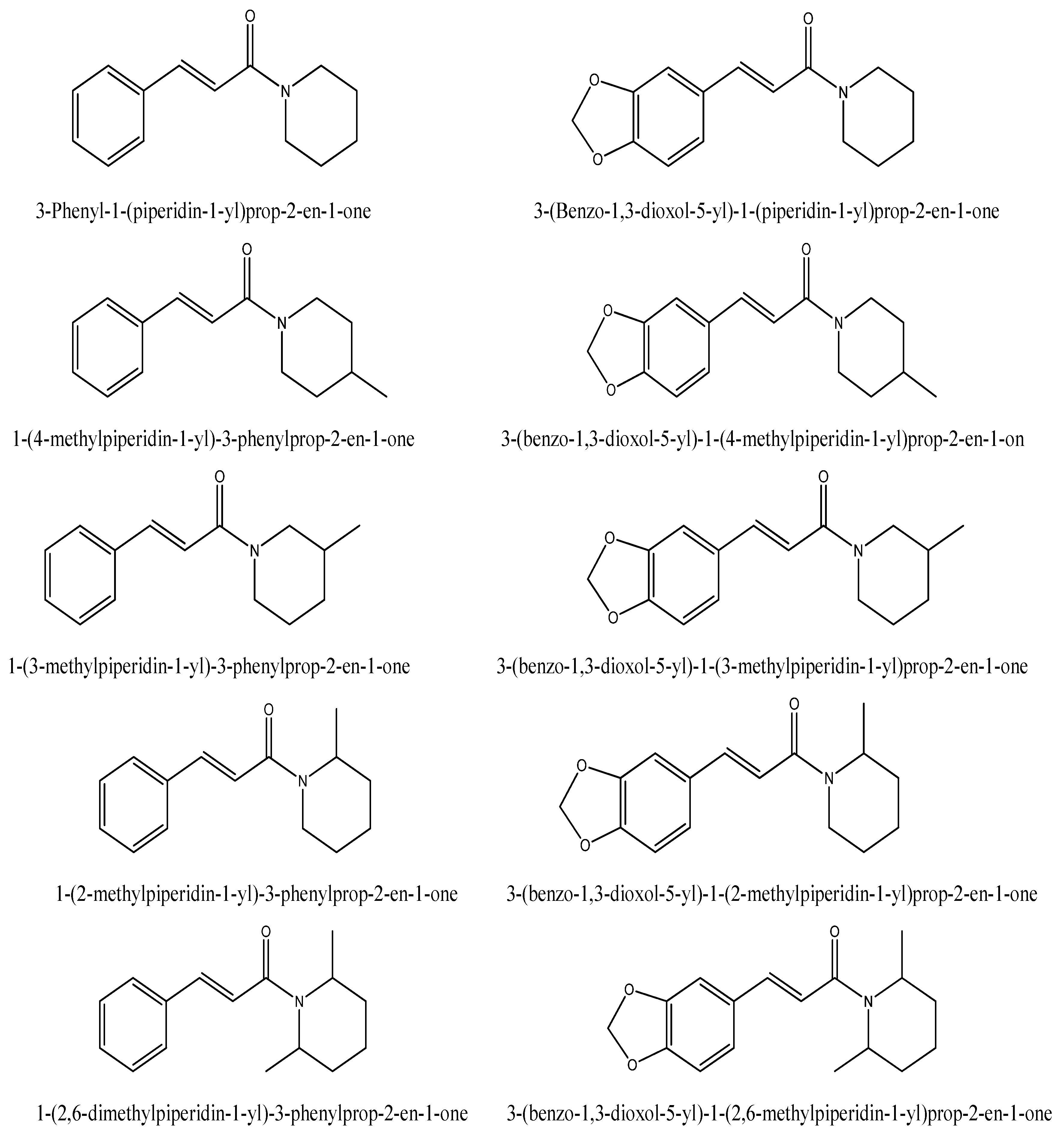 Piperine is a piperidine alkaloid that contains the methylenedioxy moiety in its structure. When the methylenedioxy moiety and dienes were removed from the structure of piperine, 1-(2-methylpiperidin-1-yl)-3-phenylprop-2-en-1-one was produced, which had moderate antifungal activities against A. flavus, but it had a potent antiaflatoxigenic effect against aflatoxin B1 when the concentration was as low as 1 μg/mL (Table 2).