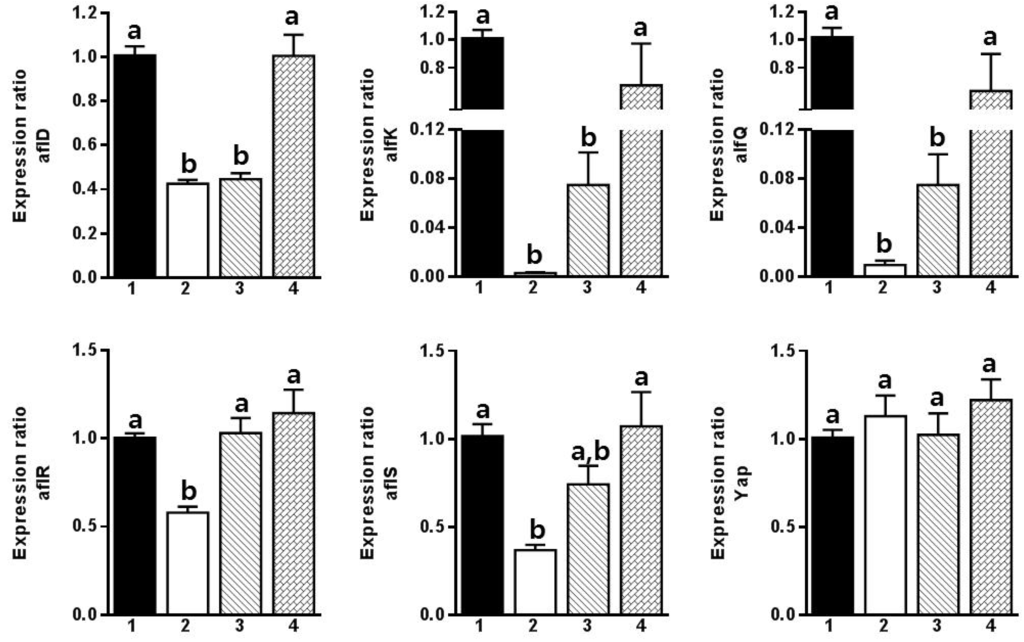 Complementary DNA (cDNA) was prepared using a Maxima First Strand cDNA Synthesis Kit (Thermo Fisher Scientific Inc., Waltham, MA, USA). The RNA extracts (2 μg) were used for compound synthesis. A Rotor-Gene SYBR Green PCR Kit (Qiagen Inc.) was used with 100 ng of cDNA for RT-qPCR analysis. Specific primers synthesized by Genotech (Daejeon, Korea) were used in this study to understand the relationship between aflatoxin biosynthesis and the chemicals tested, i.e., primers for yap, aflR, aflS, aflK, aflD, and aflQ 18S rRNA (Table 3). The amplification processes were performed as follows: denaturation at 95 °C for 30 s, annealing at 60 °C for 20 s, and elongation at 72 °C for 30 s. Forty rounds amplification were conducted according to the thermal cycling procedure with a postcycling step at 95 °C for 5 min. RT-qPCR was performed three times for each sample. Differences in gene expression after the addition of the test chemicals were calculated using the ΔCt method. The data were normalized against the 18S rRNA levels and the gene expression levels were compared.