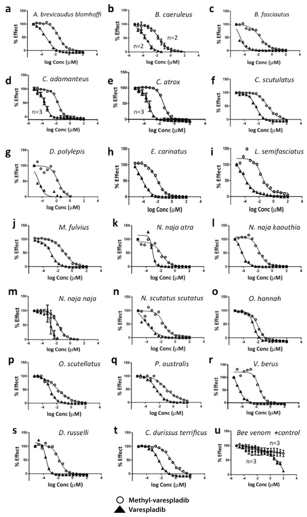| Venom | Geographic Range | Varespladib IC50 µM | Me-Varespladib IC50 µM |